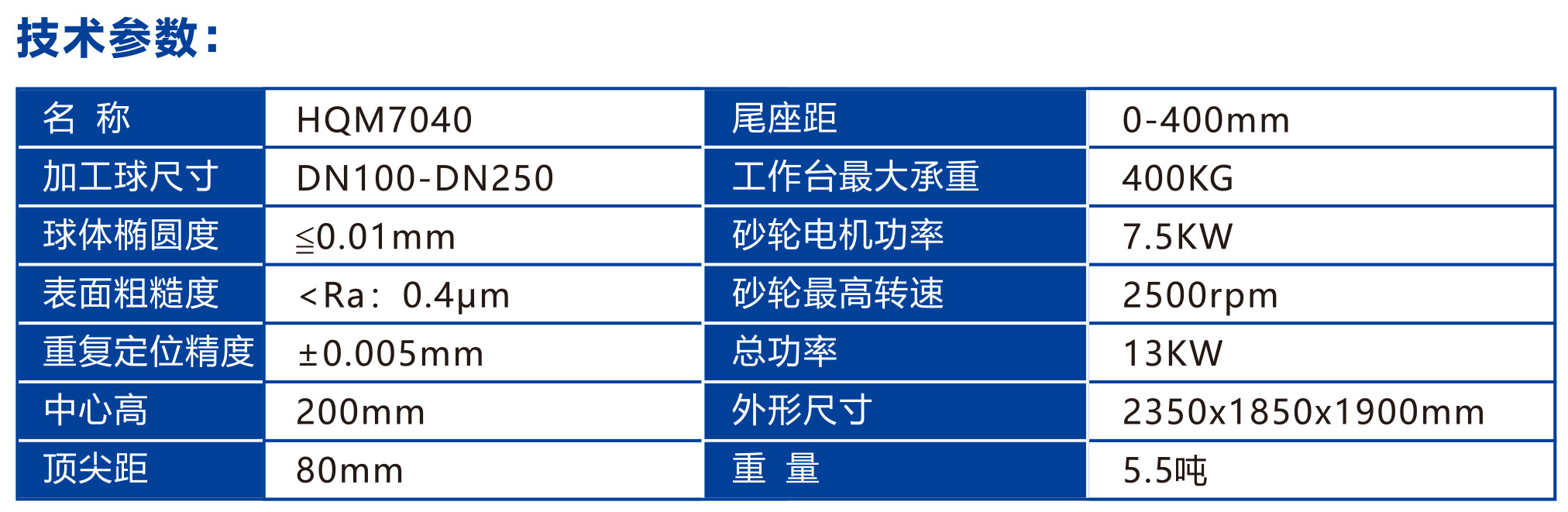 尖顶紧。采用伺服控制硬轨滑台移动,倾覆力矩大。铸造床身承重好,抗震。主轴箱使用高刚性轴承结构,加工达到IT4-1T5级精度,加工表面粗糙度可达到Ra0.4um。